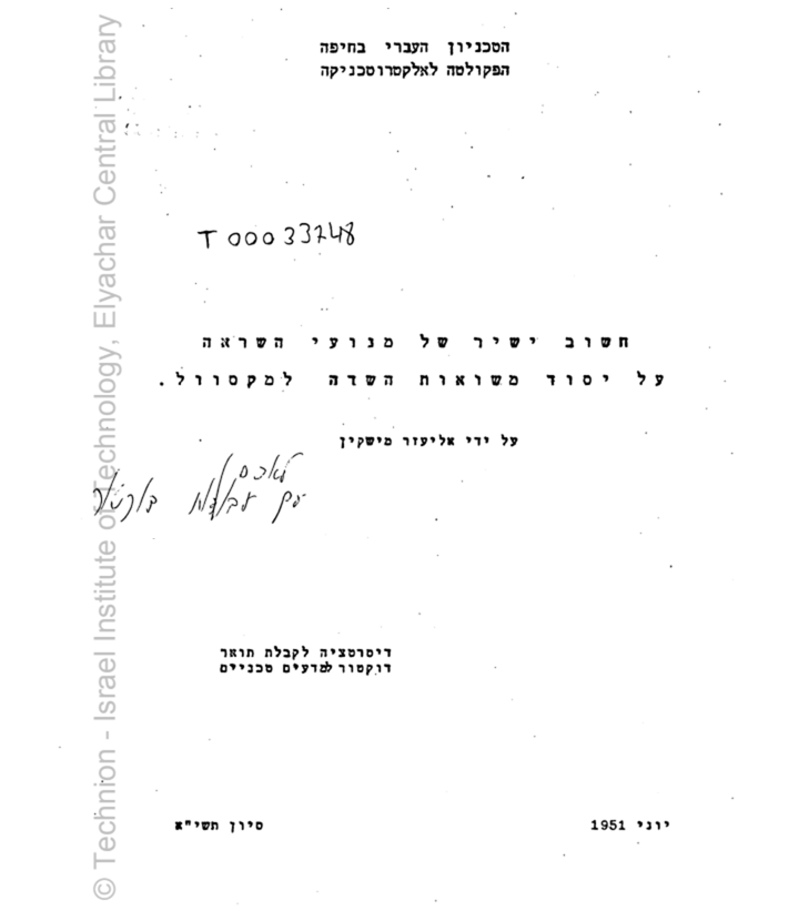 בנובמבר 1952 הוענק תואר הדוקטור הראשון בטכניון לד”ר אליעזר מישקין, שחקר בעבודת הדוקטורט “חישוב ישיר של מנועי השראה על יסוד משוואות השדה למקסווול” בהנחיית פרופ’ פרנץ אולנדורף – מייסד המחלקה שהפכה לימים לפקולטה להנדסת חשמל ומחשבים ע”ש ויטרבי. התואר שקיבל מישקין נקרא “דוקטור למדעים טכניים”, והאירוע זכה בסיקור בין-לאומי מרשים. העיתון The American Jewish World דיווח כי “תואר הדוקטור הראשון במדעי הטכנולוגיה הוענק ב־Haifa Technical Institute (הטכניון) לד”ר אליעזר מישקין”, והדגיש כי מישקין היה מרצה לחשמל ובוגר הטכניון בעצמו. מישקין המשיך לקריירה אקדמית מרשימה, שכללה מחקר ב־MIT ובהרווארד ופרופסורה בפיזיקה יישומית ובהנדסת חשמל במכון הפוליטכני של ניו־יורק (1959–1987).
