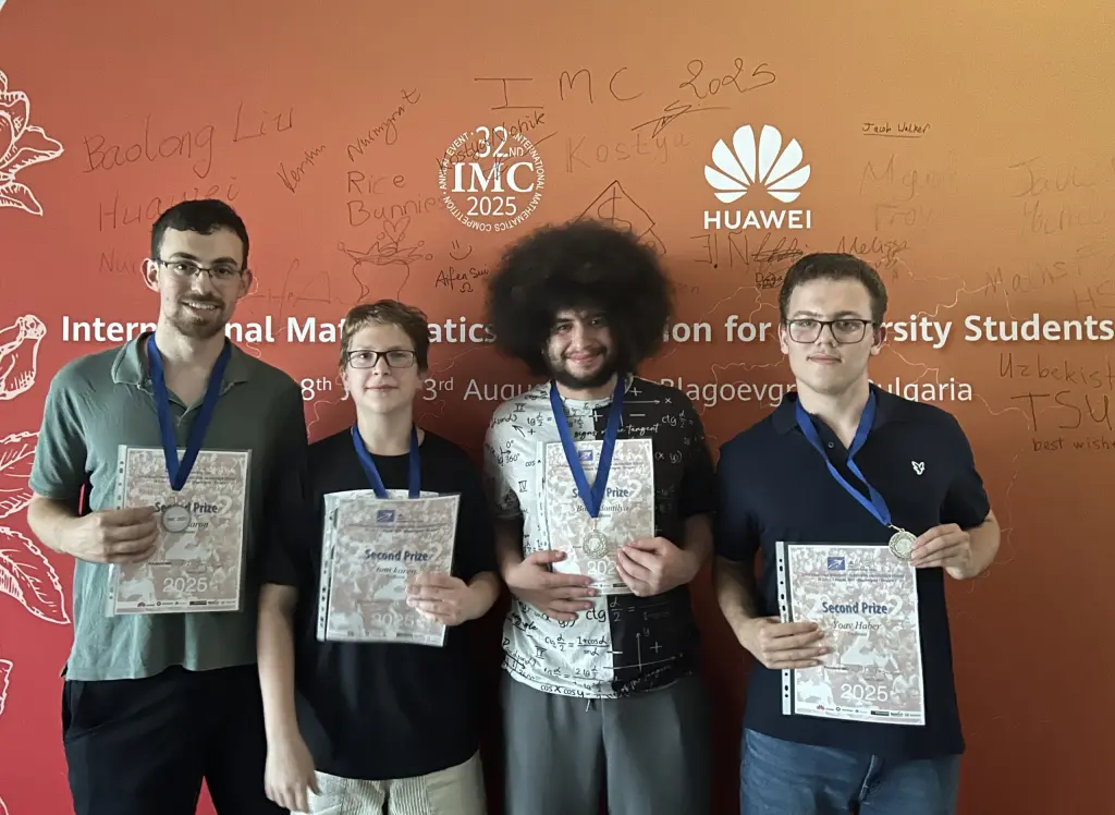 ארבעת חברי נבחרת הסטודנטים של הטכניון במתמטיקה חזרו עם מדליות כסף מאולימפיאדת המתמטיקה הבין-לאומית בבולגריה, IMC2025, ודורגו כנבחרת במקומות 27-28 מתוך כ-80 אוניברסיטאות מובילות מכל רחבי העולם. כל חברי הנבחרת הם סטודנטים במסלולי המתמטיקה בטכניון.