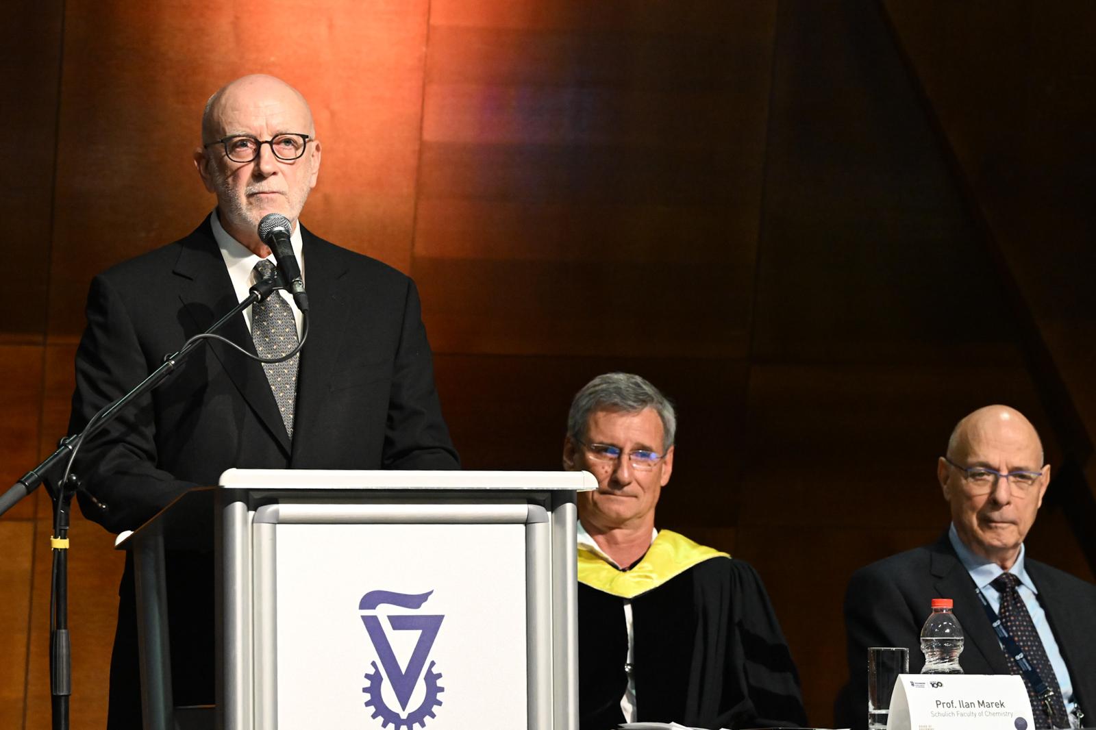 Chairman of the Board of Governors Scott Leemaster said: “When I stood on this stage a few years ago, I told you what I feel every time I land in Tel Aviv – that these are interesting times. Today I say: these are consequential times. I find comfort and hope in knowing that together we are strong. Look at the campus around you – this is a place of partnership, not isolation. Our students and faculty members are required to cross boundaries in order to lead the next breakthroughs. Collaboration is the foundation, and not just within the Technion – we have campuses in New York and China as part of the global mark we are making. We must continue to strengthen our commitment to progress, and we must provide our students not only with scientific and technological tools but also with social and ethical awareness. As I said, these are consequential times – not only for Israel but also for all of humanity – but I have no doubt that in the Technion’s resilience and its commitment to mankind lies a promising future for humanity.”‘