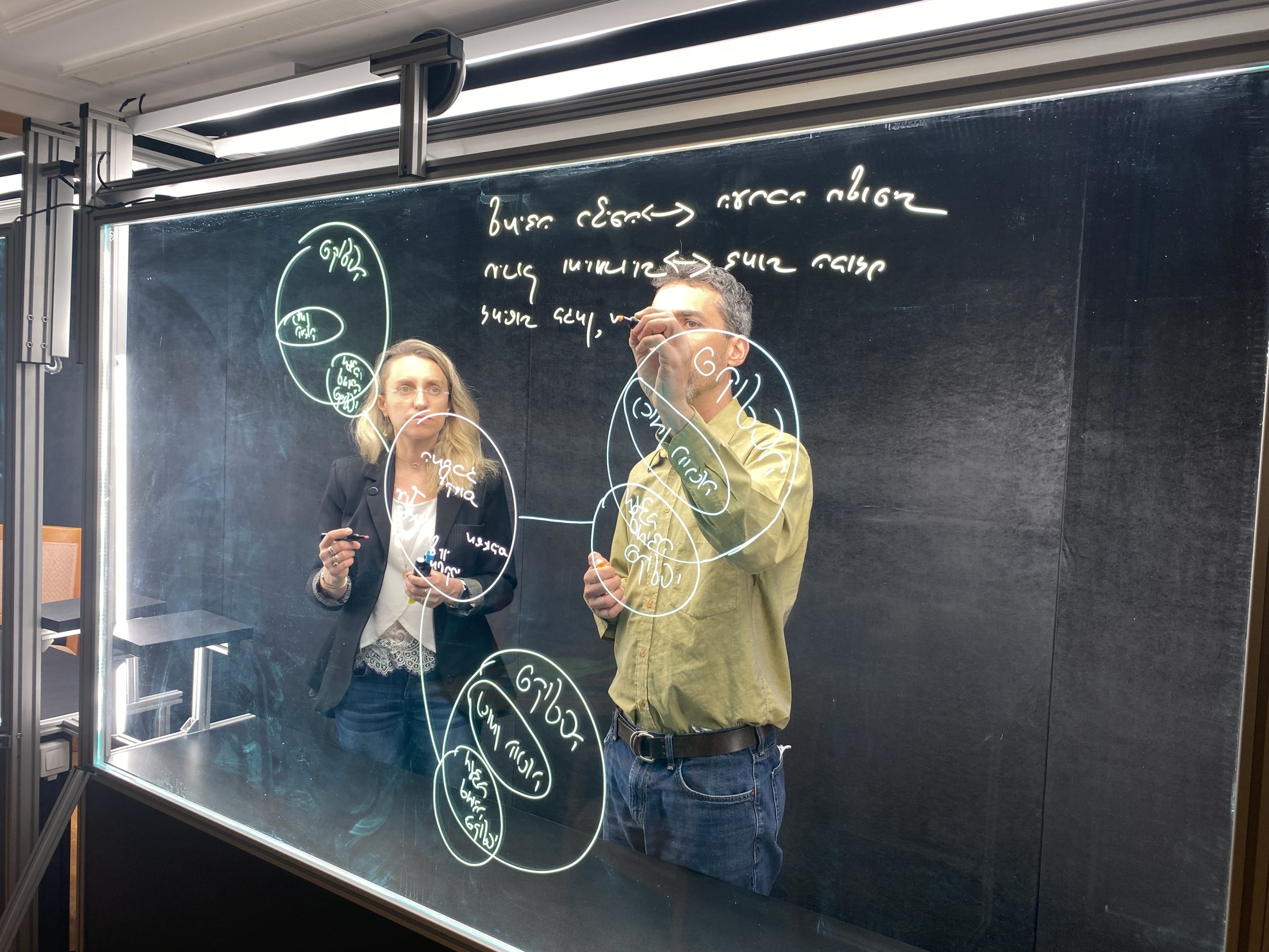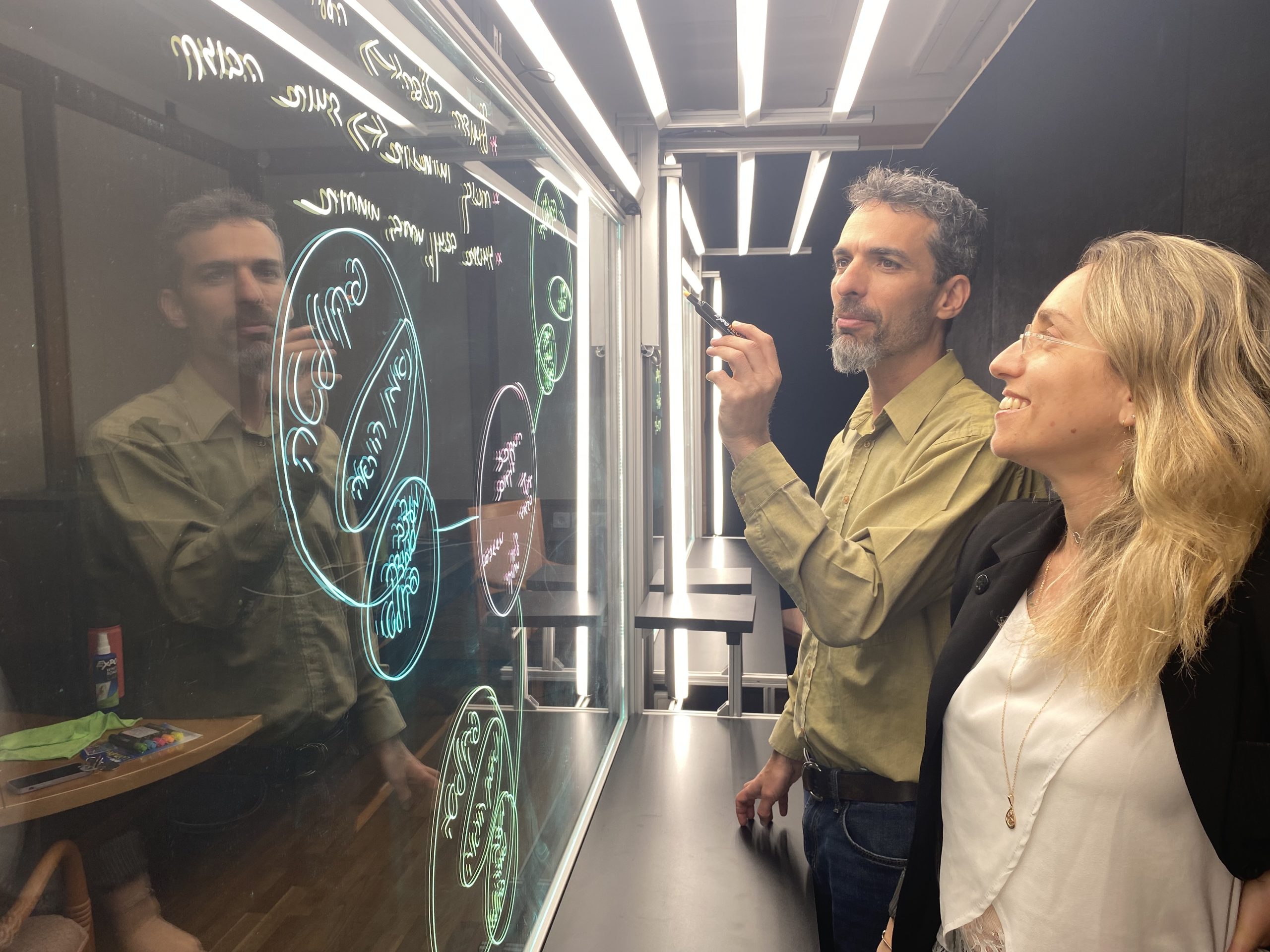 Prof. Ido Roll and Dr. Olga Chuntonov use an electronic light board to record a lecture